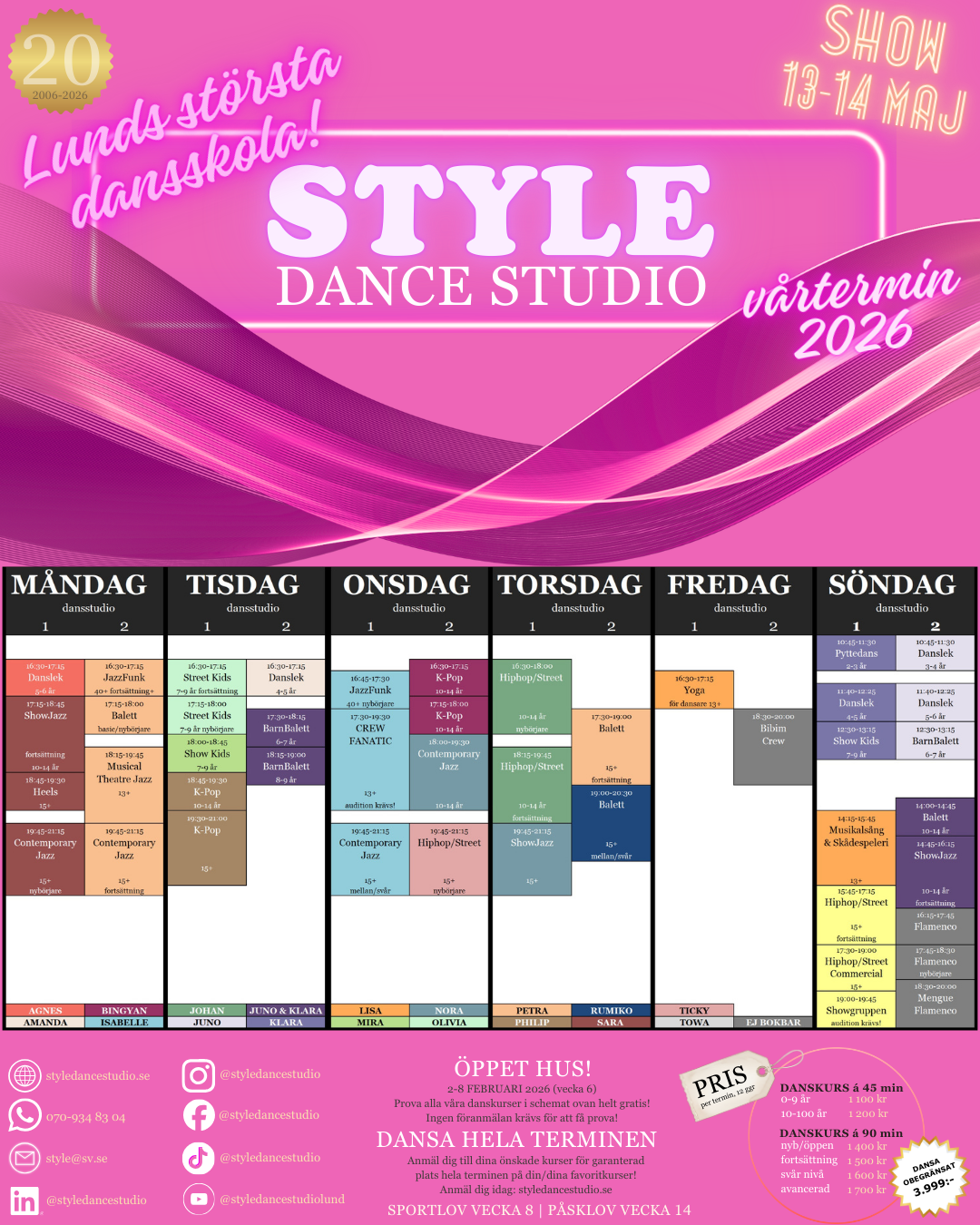 Under vårterminen 2026 har vi uppehåll för sportlov vecka 8 och påsklov vecka 14, måndag 30 mars – söndag 5 april. Vi dansar måndag 6 april (annandag påsk).